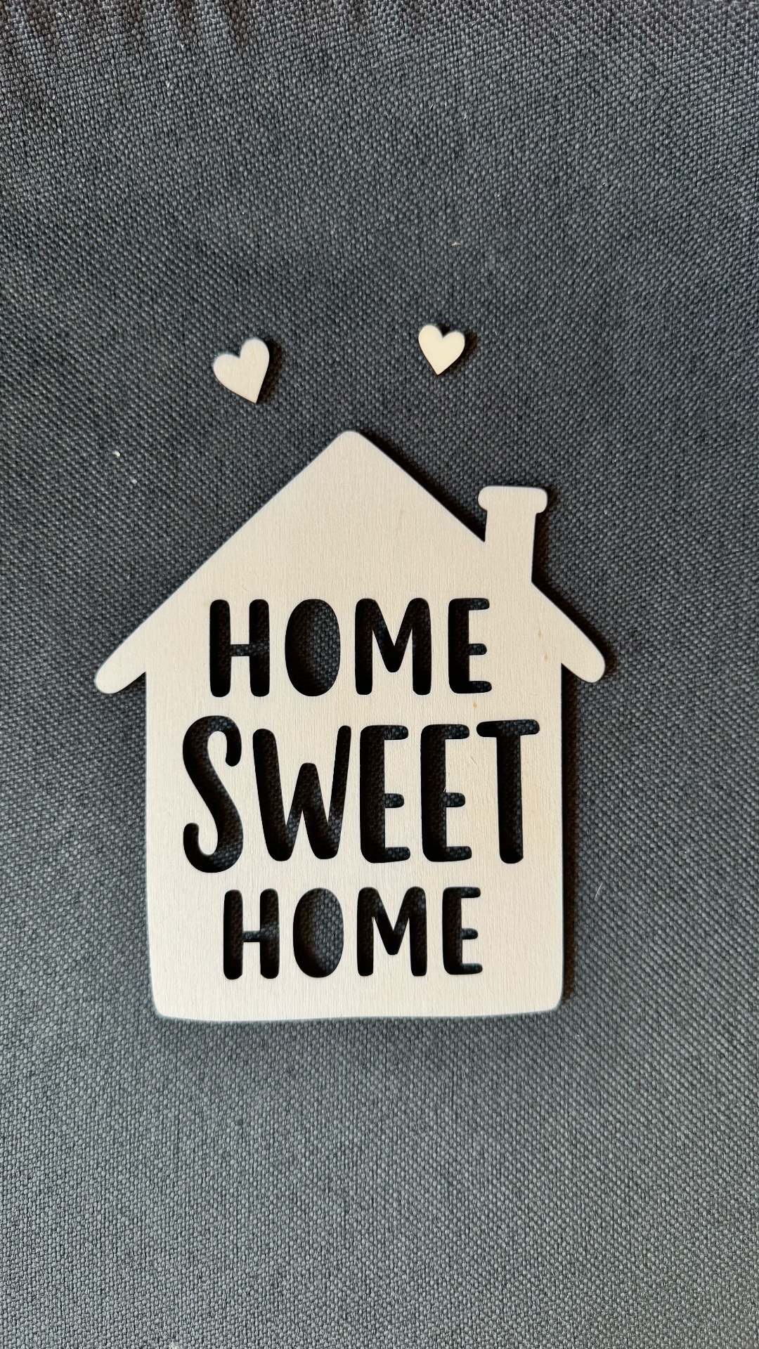 Dřevěný obrázek ve tvaru domečku s vyřezaným nápisem HOME SWEET HOME, volně umístitelné dvě srdíčka