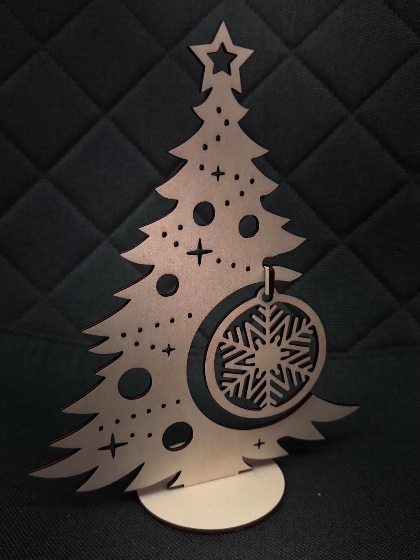Dřevěný vánoční stromeček s podstavcem a zavěšenou baňkou.