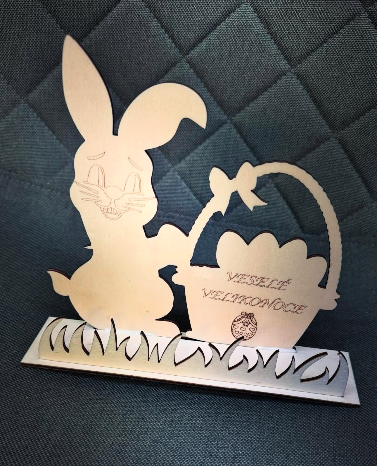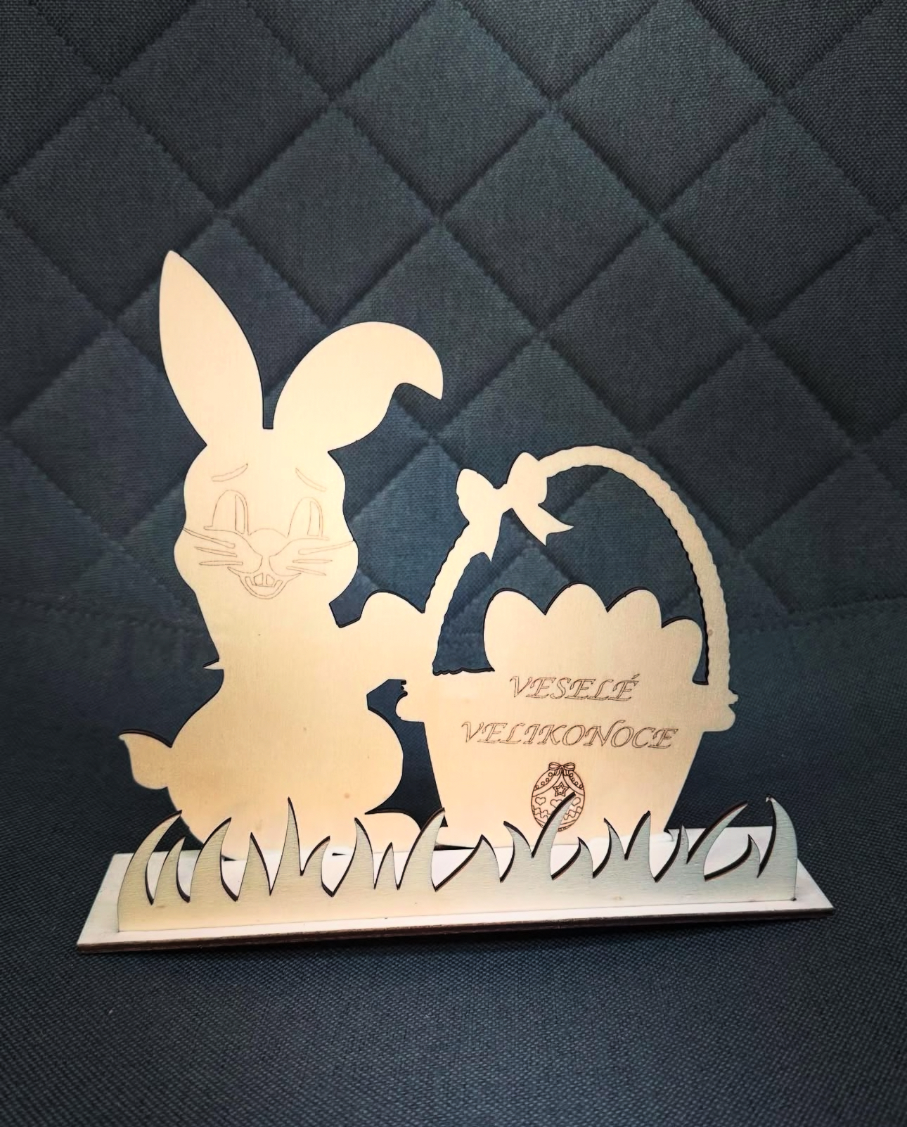 Dřevěný zajíček s košíkem a s gravírováním VESELÉ VELIKONOCE